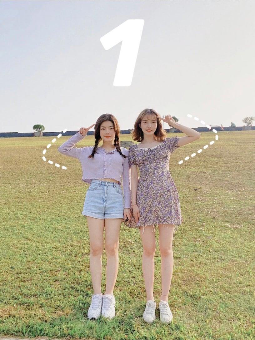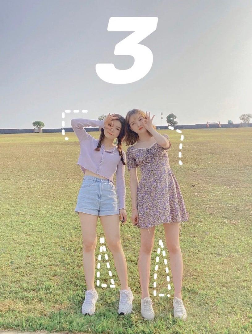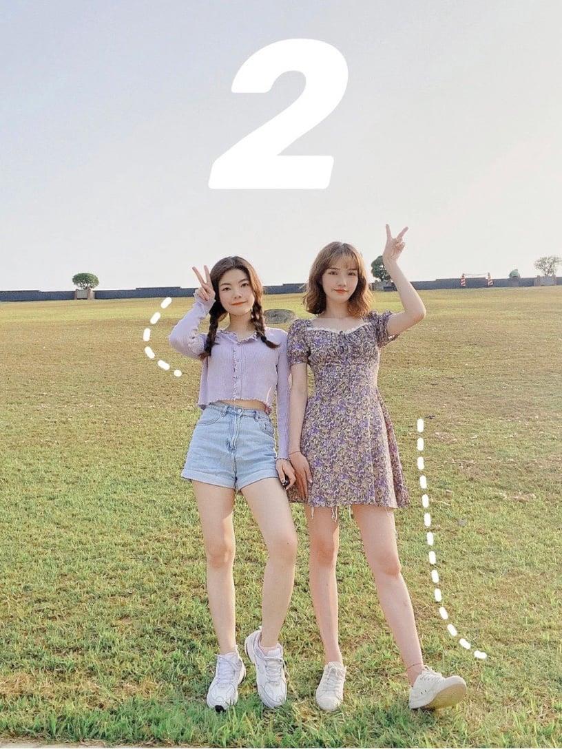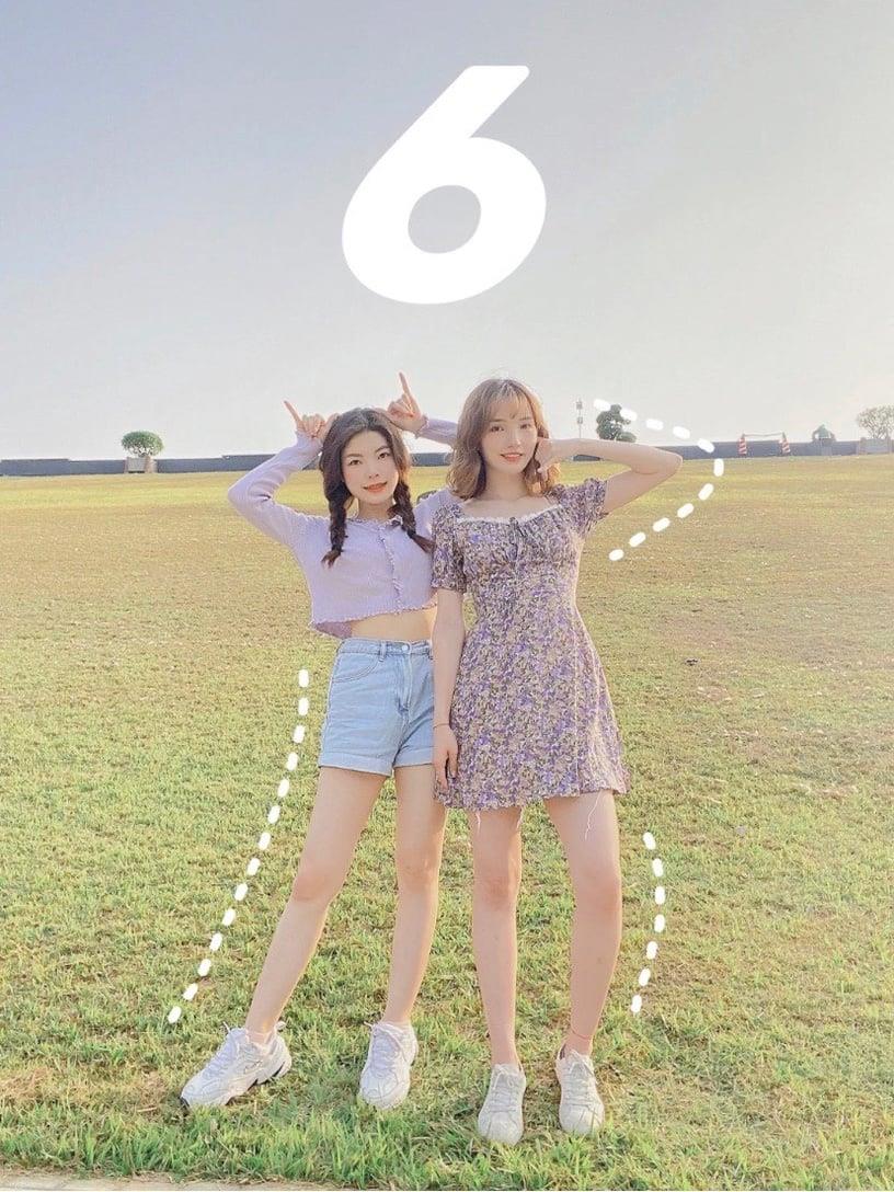 一人站前一人站后靠着肩膀,这样姿势很自然很亲密,也可以让视觉上有层次感,将腿往侧边伸,或是微屈膝都能制造出显瘦效果~别忘了我们数字拍照手势,一人双手比6放头顶,一人单手比6放在脸颊做出讲电话的姿势,制造可爱感。
