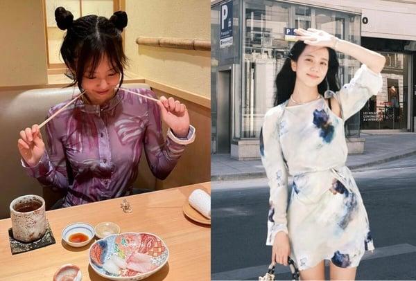 BlackPink的Jennie、Jisoo也有穿!Jennie身穿一件202春夏系列的粉色蝴蝶结上衣,配上包包头,真的可爱满分 ; Jisoo则是穿上印花洋装,走在街上真的让人目不转睛。