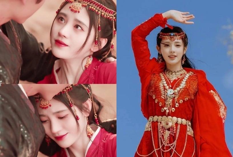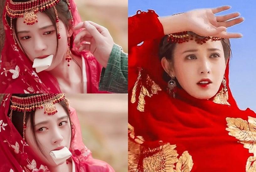 鞠婧祎在《如意芳霏》这套红色的异域造型就曾引起热议,因为和彭小苒在《东宫》的造型相似度百分百,同样都是全身红、面纱、西域珠饰。