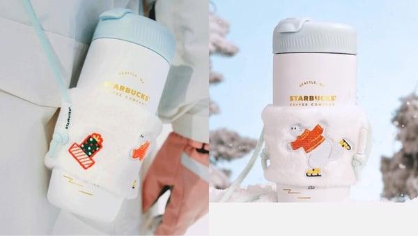 “双饮口不锈钢杯配北极熊杯套”是以510ml蓝白色双饮杯,杯身上缀有金色LOGO、水豚滑雪标志,每个细节都很精致,附上毛绒绒的北极熊杯套,外出携带超便利。